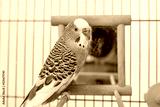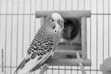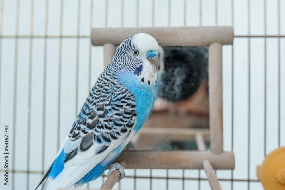 Funny budgerigar. Cute blue budgie pa parrot sits in cage and plays with mirror.