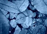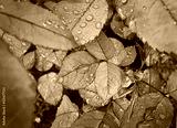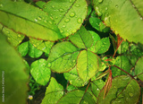Rain drops on green leaves. Close up rose leaf with dew droplets. Natural background textures