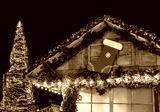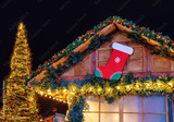 Christmas stocking on house roof. Decorations of Christmas Market. Defocused illuminated tree on background.