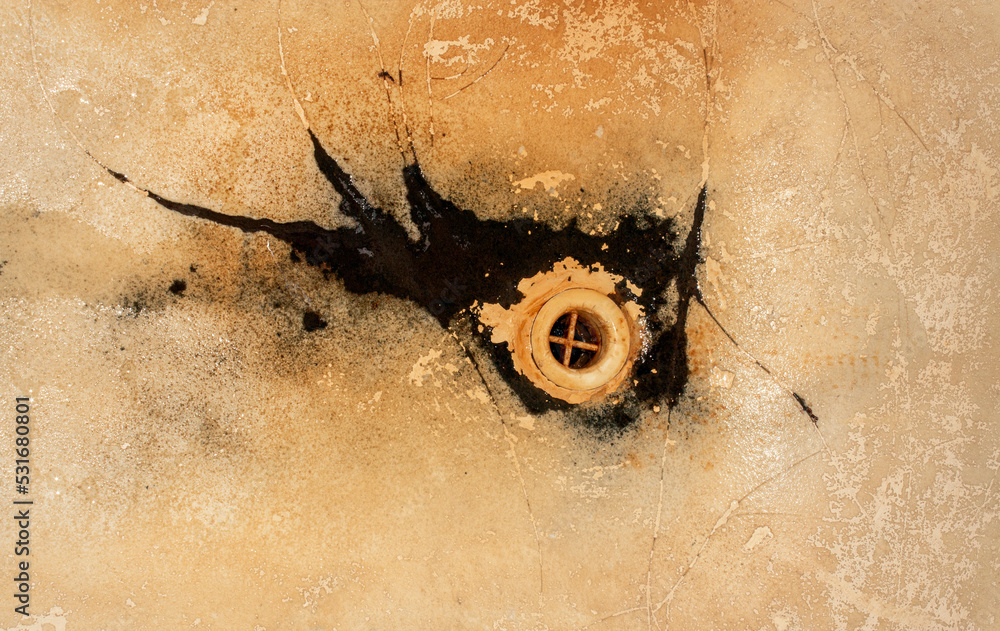 An old cast-iron rusty bathtub with cracks.Background of a rusty cast-iron bathtub.The drain in the bathroom is covered with rust.