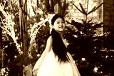 little beautiful asian girl in white dress and crown sit in loft room decorated with wooden greenhouse and Christmas trees with twinkle lights, diverse people, Christmas and New Year celebration