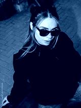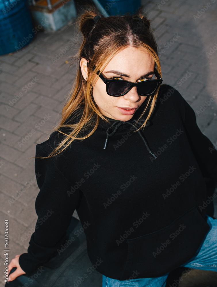 City portrait of beautiful young female wearing black blank hoodie and blue jeans with space for your logo or design. Mockup for print