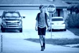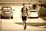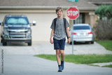 Young handsome smiling teenager boy with backpack happy going to school on sunny day