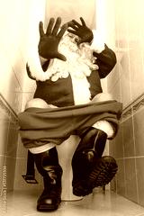 Santa Claus is surprised from the paparazzi photographer when sitting on the toilet