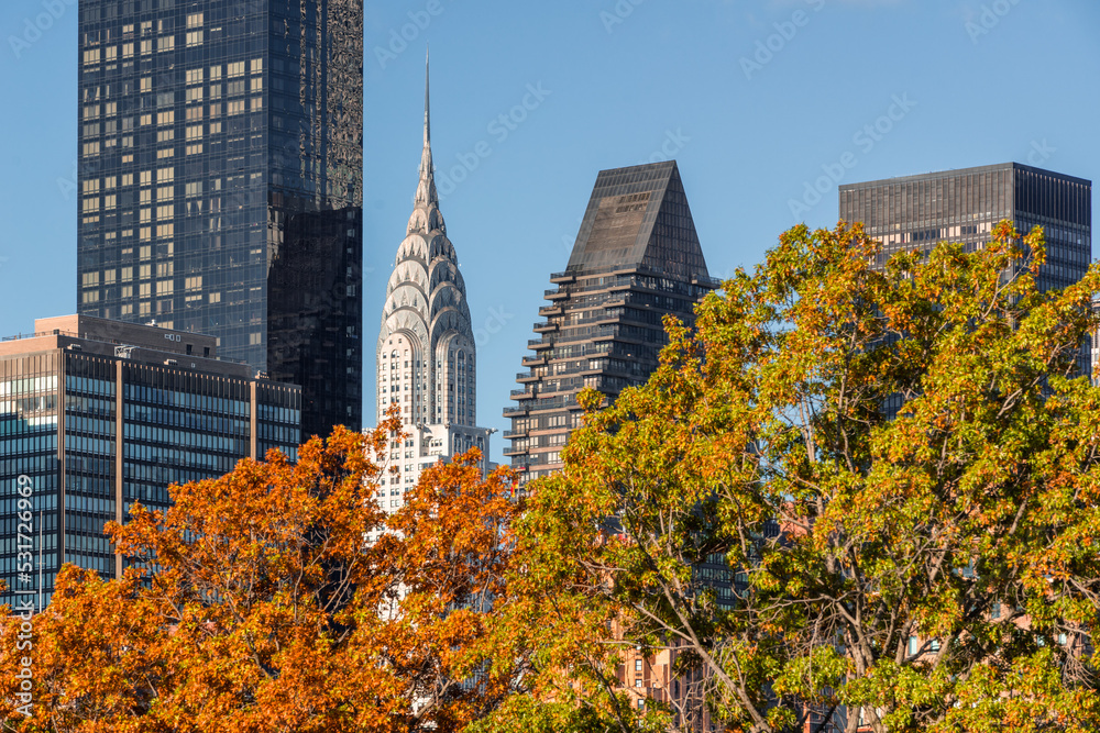 New York City skyline in Fall. Midtown Manhattan with landmark skyscrapers from Upper East Side