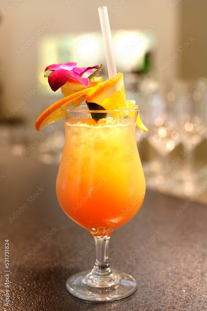 Tequila sunrise cocktail in a glass. A drink with layered colors, made of orange juice, grenadine, tequila.