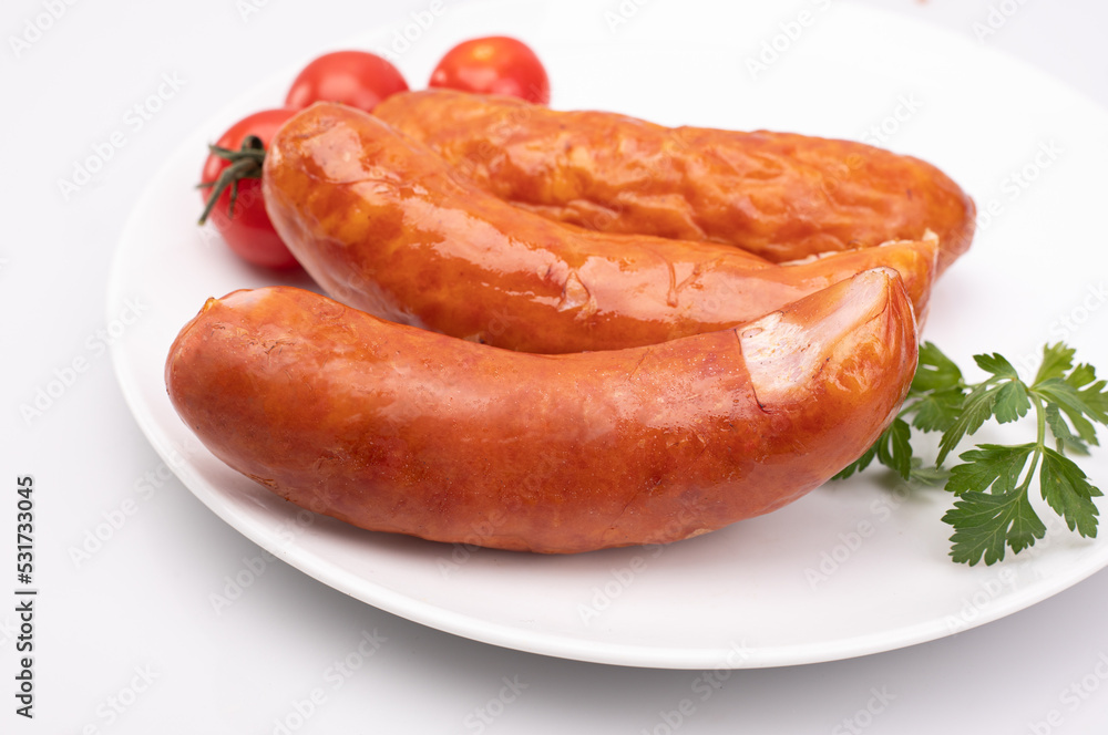 Smoked pork sausage on a white plate, isolated. Polish meat sausage, horizontal view.