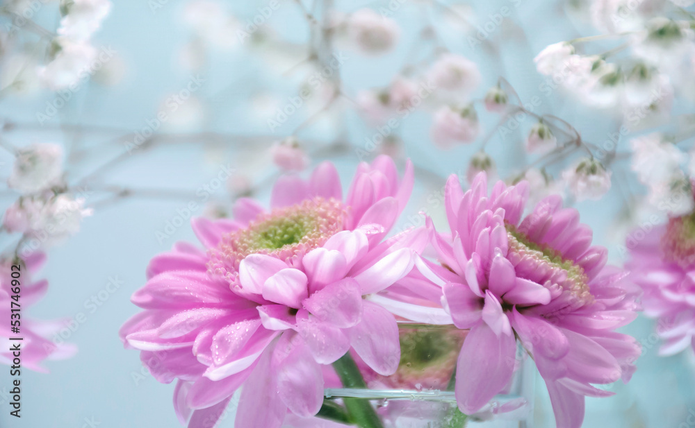 Few big pink flowers on blue background