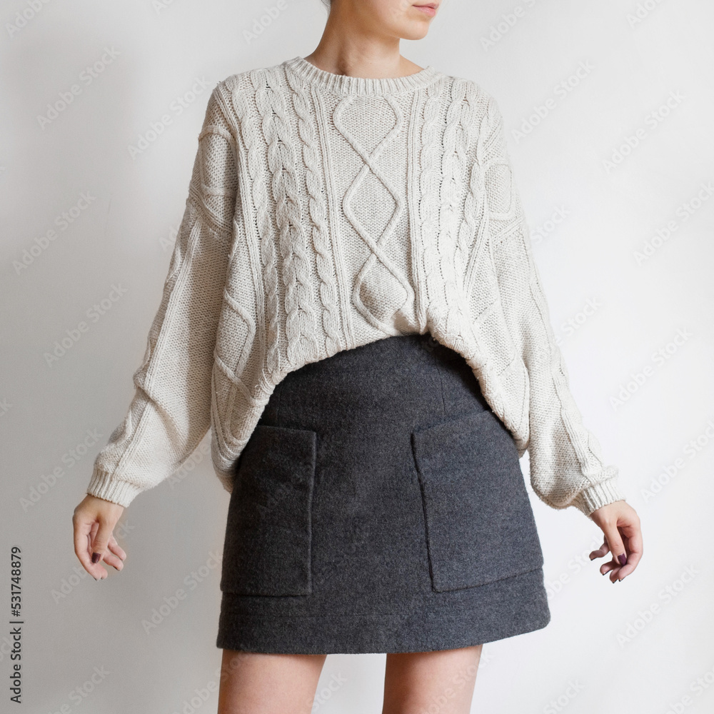 Woman wearing oversized white sweater and woolen mini skirt isolated on white background