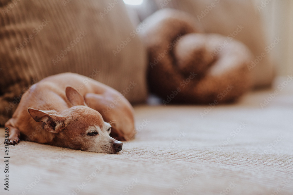 Cute chihuahua pet is laying on the sofa at home. Copy space.