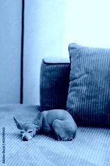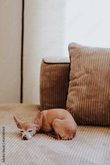 Cute chihuahua pet is laying on the sofa at home. Copy space.