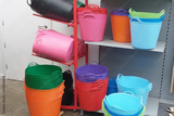 Buckets and laundry baskets made of soft plastic in different colors on sale in a hardware store