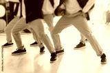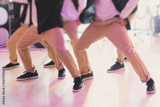 Group of hip-hop dancers performance on a stage, modern contemporary street dance with break dancing in studio, hip hop dance training in a ballroom, legs in sneakers close up