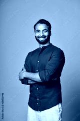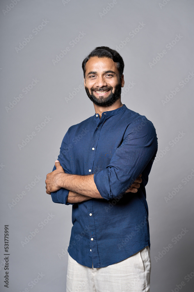Smiling bearded indian business man investor, happy ethnic ceo, corporate executive, professional lawyer, successful rich banker, male office employee or salesman isolated on gray, vertical portrait.