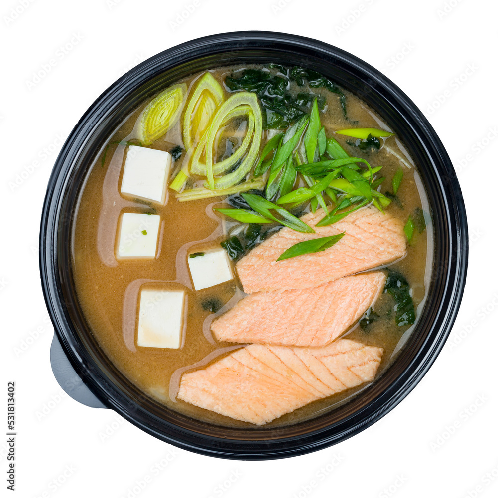 soup miso with salmon, green onion and tofu cheese on black bowl isolated on white background top view