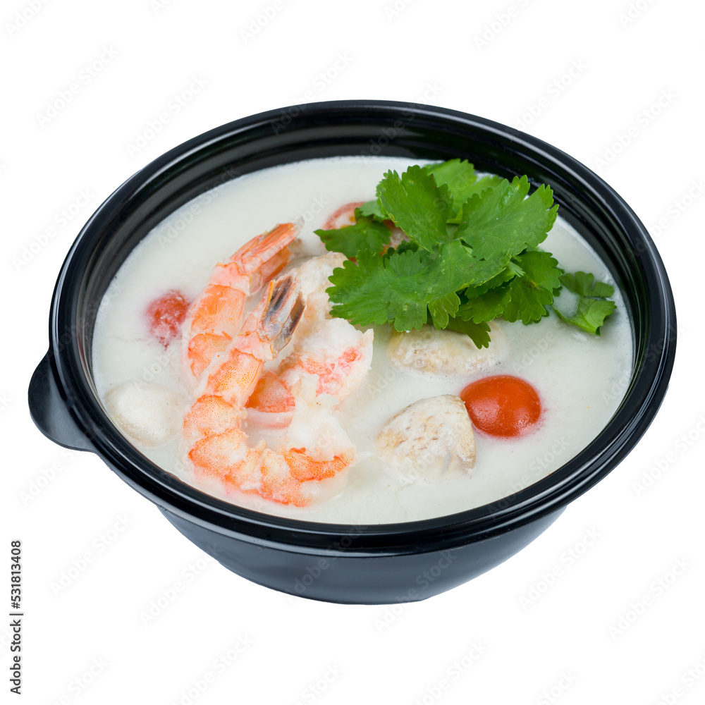 tom kha soup with shrimps, mushrooms and tomatoes on black bowl isolated on white background