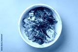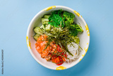 Poke with salmon, avocado,cucumber,chukka,tomatoes,broccoli and rice top view on blue background