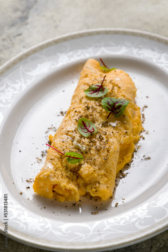 classic omelet with truffle on plate on stone table side view macro close up, vertical