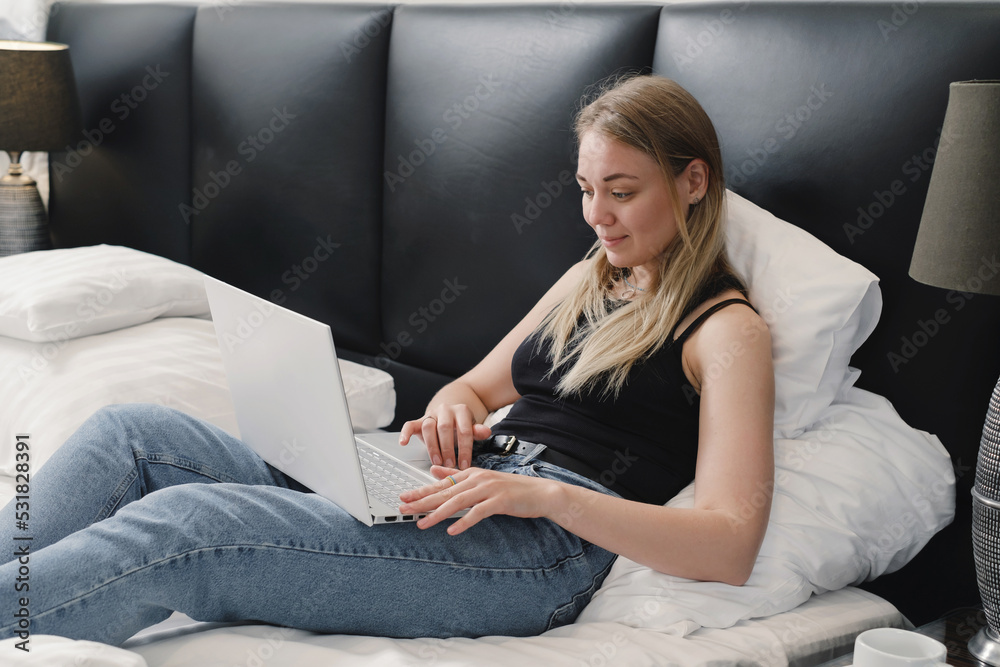 Woman working with laptop in hotel room. Happy young freelancer working on-line while traveling. Person having remote, distant work