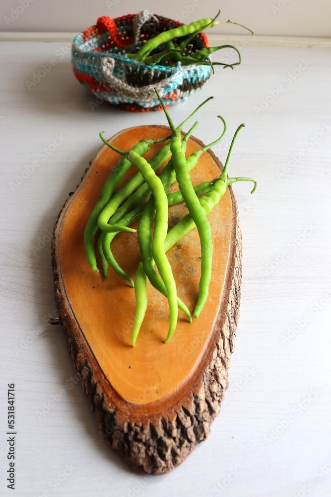 Farm fresh organic Green chili peppers. Freshly harvested healthy and spicy chilies in a basket on a green background. Copy space.