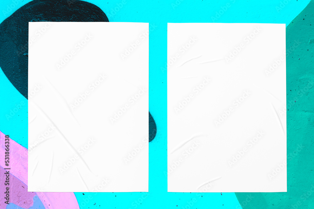 Colorful messy painted black, purple, teal urban wall texture with two wrinkled glued poster templates. Modern mockup for design presentation. Creative pink mint green blue urban city background.