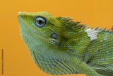 Closeup head of Green lizard with yellow background, green lizard closeup head, Closeup head Jubata Lizard