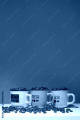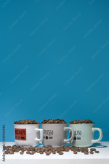espresso and more. macchiato americano. Coffee grains in mugs with various names on a blue background vertically
