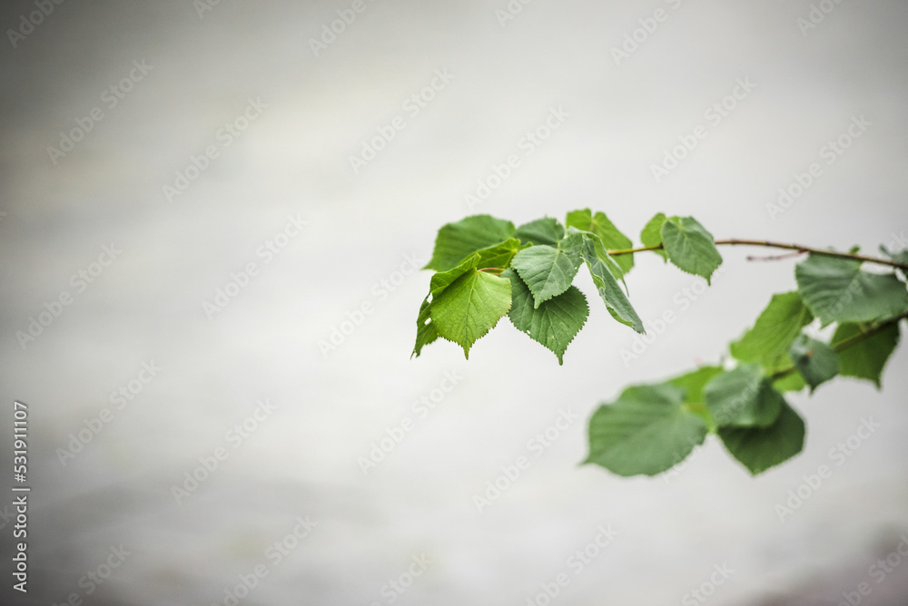 A branch with green leaves on the background of a city sidewalk