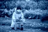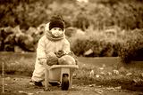 a child in yellow overalls drives a toy car with vegetables against the backdrop of a vegetable garden and cabbage beds