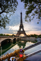 Eiffel Tower by the Seine River in Paris at sunrise. France