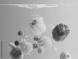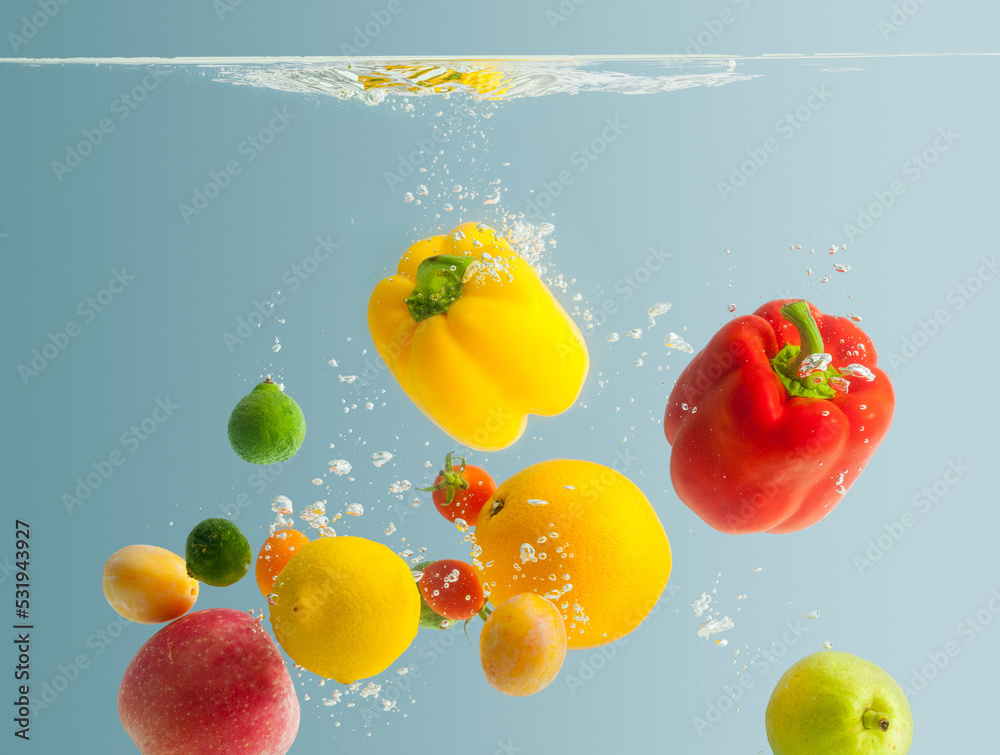 fresh fruits and vegetables falling into water with air bubbles on blue background.