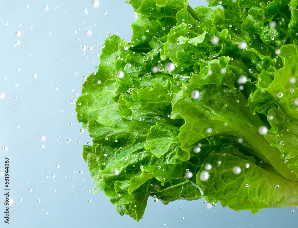 close up of fresh lettuce leaf with water droplet on blue background.