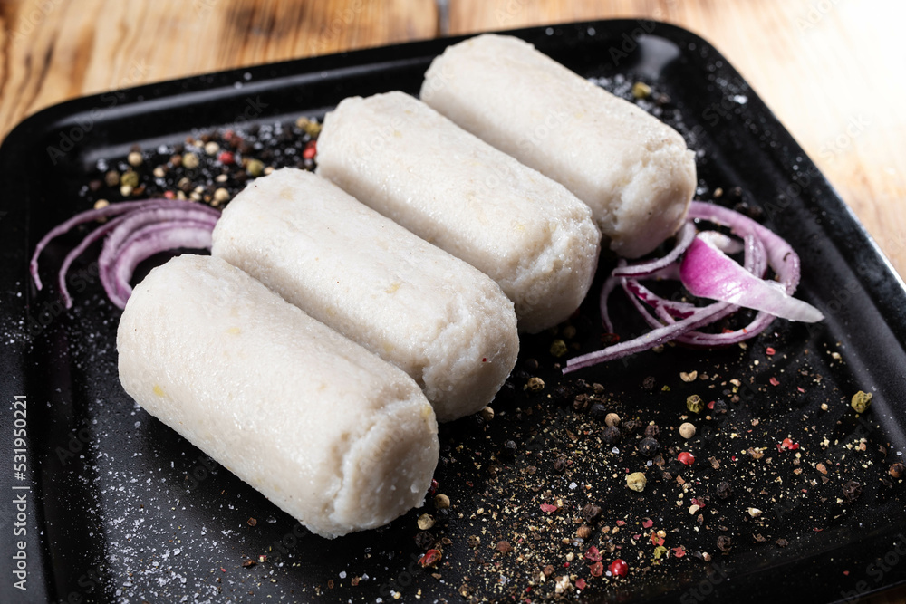 Polish kartacze on a black plate. Traditional potato dumplings with meat stuffing, sprinkled with freshly ground pepper.