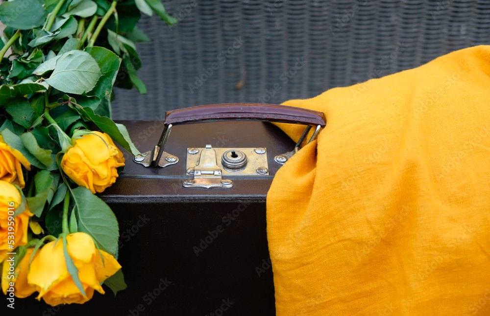 Old brown suitcase with a metal lock. Yellow withered roses and yellow clothes on the case.