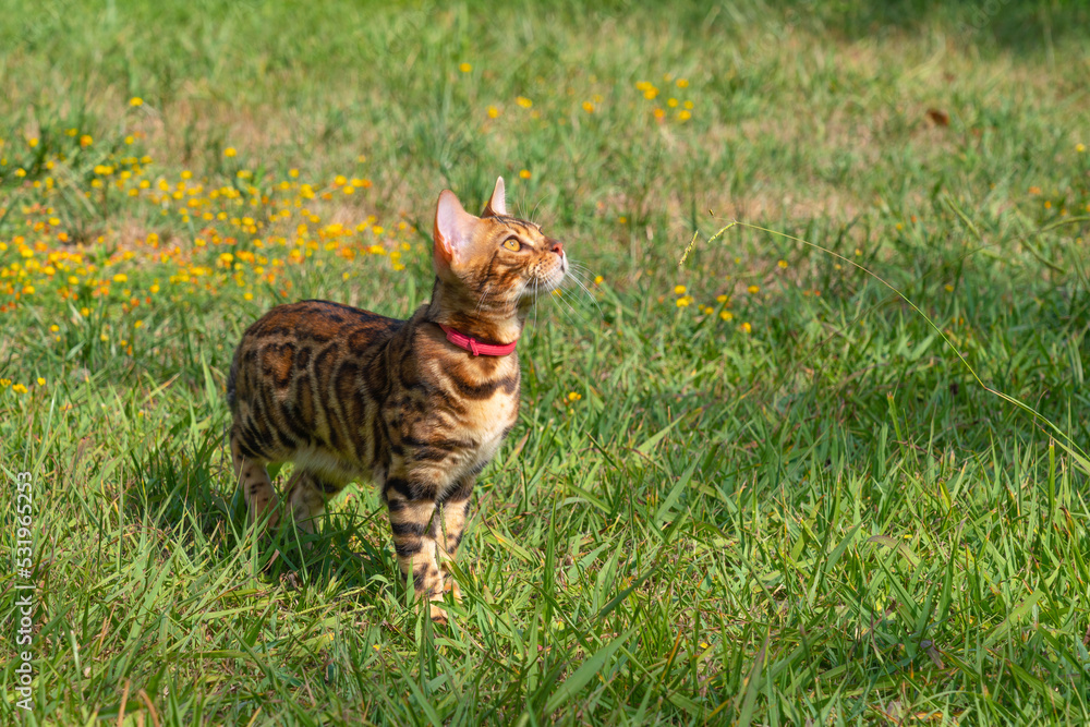 Beautiful young bengal cat in the garden