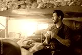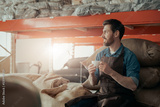 Business owner with cup of fresh coffee sitting on bags with roasted coffee beans and looking away