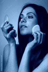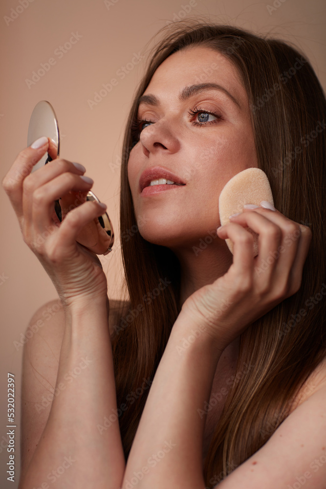 Woman applies makeup with flocked sponge. Female face portrait with real natural skin isolated on beige background.