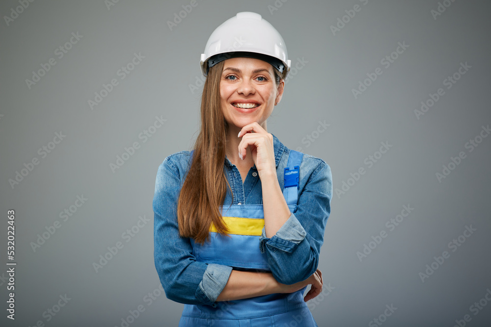 Thinking woman architect or engineer in white safety helmet. Isolated female portrait.