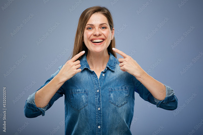 Young woman pointing at teeth. Smile with white teeth. Isolated portrait on blue.