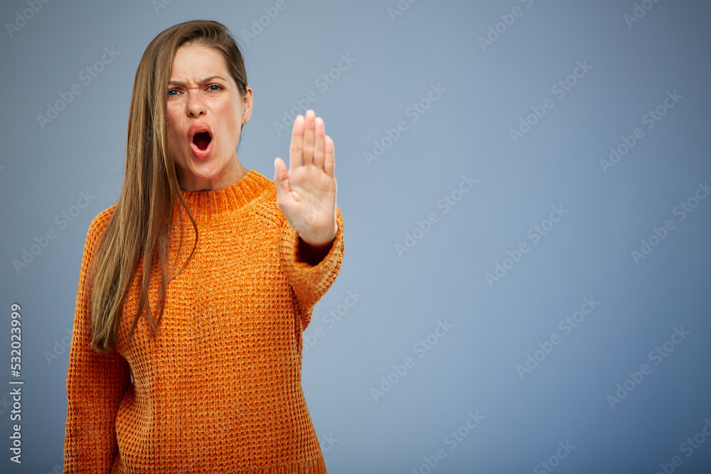 Woman in casual orange sweater doing stop gesture with hands. isolated female portrait on blue.