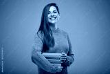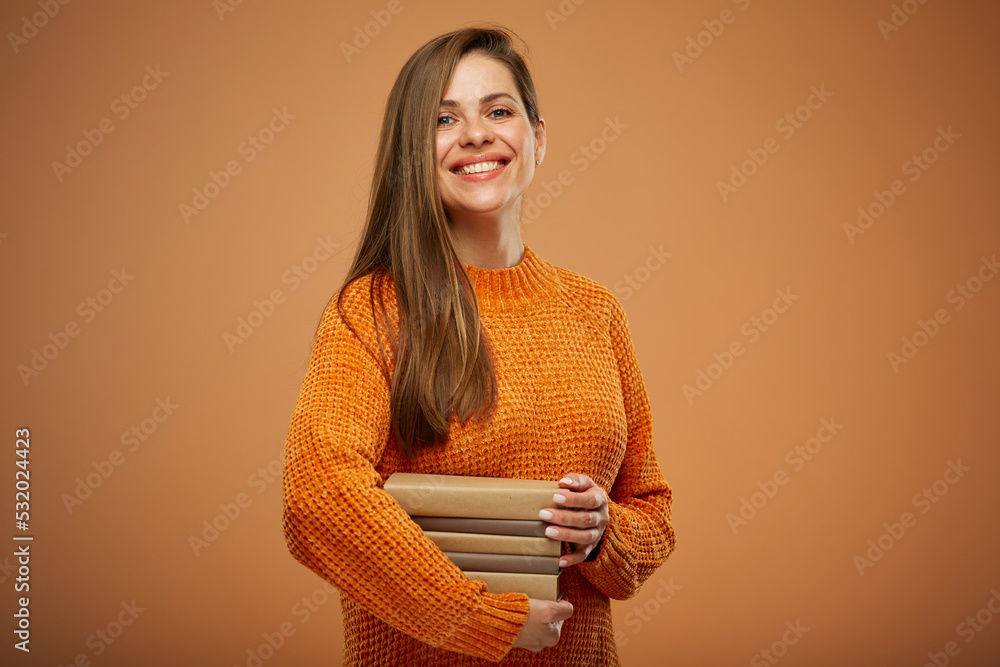 Smiling student woman in casual orange sweater holding books stack. isolated portrait .