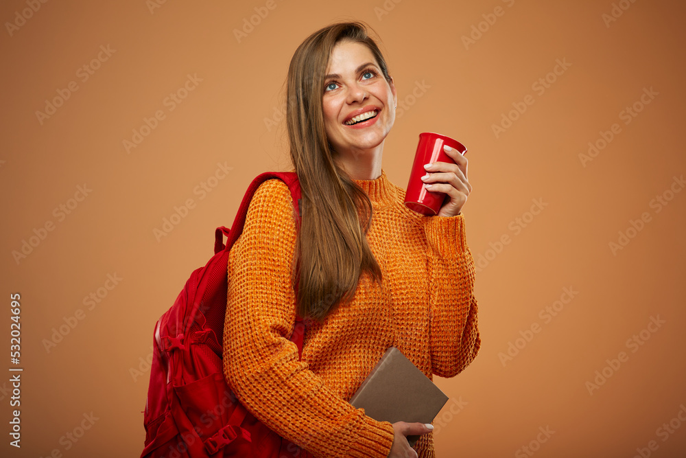 Student millennial woman with book and backpack holding red coffee cup and looking up. Isolated female portrait.