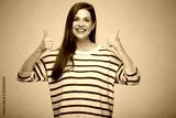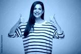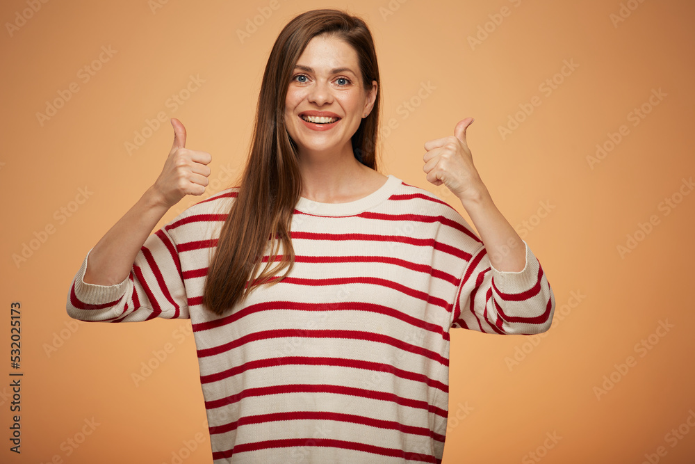 Smiling woman in casual clothes shows two thumb up. Isolated female portrait.