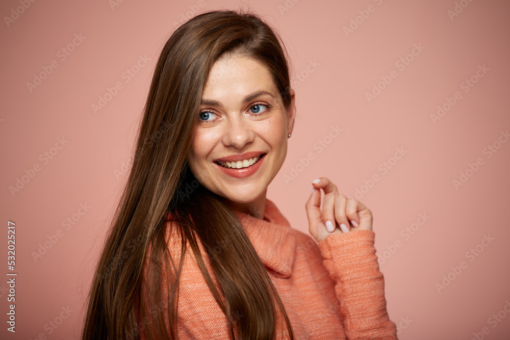 Close up female face with natural real skin. Isolated portrait on pink background. Woman with long hair in orange hoodie looking at side.