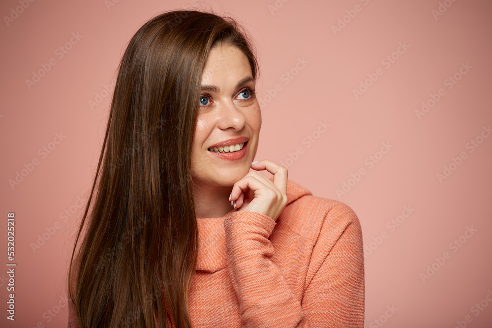 Close up female face with natural real skin. Isolated portrait on pink background. Girl touching her face and looking away.