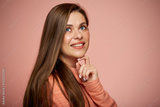Close up female face with natural real skin. Isolated portrait on pink background. Girl touching her face and looking away.