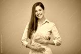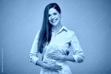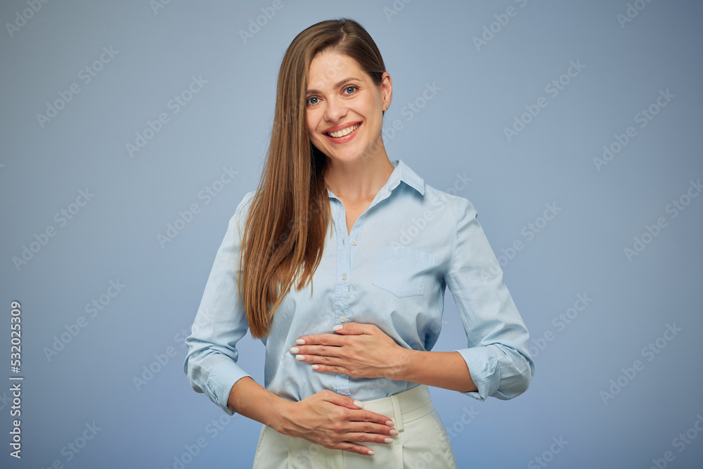 Young woman holding hands on stomach. isolated portrait. Happy girl on blue background.