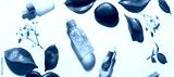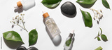 Composition with bottles of cosmetic serum, spa stones, plant leaves and flowers on white background