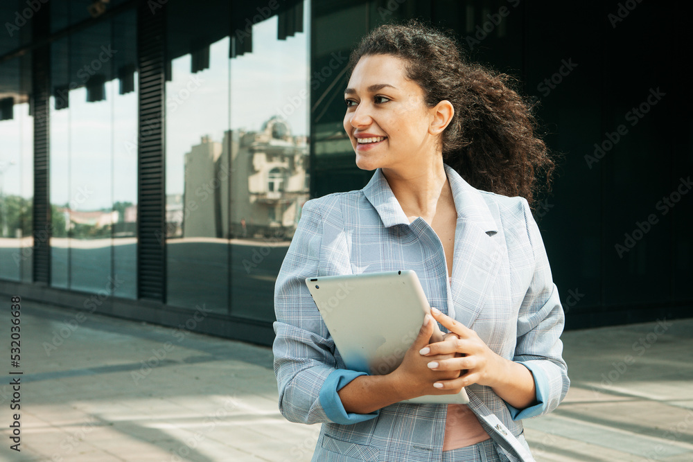 Young stylish mixed race woman uses tablet computer near office building on summer day.