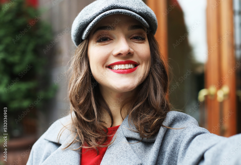Lovely woman in stylish grey hat and coat making selfie while walking past old building.